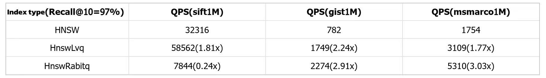 1. The original HNSW can attain a higher accuracy ceiling compared to HnswLvq and HnswRabitq. If users have extremely high accuracy requirements, this strategy should be prioritized.