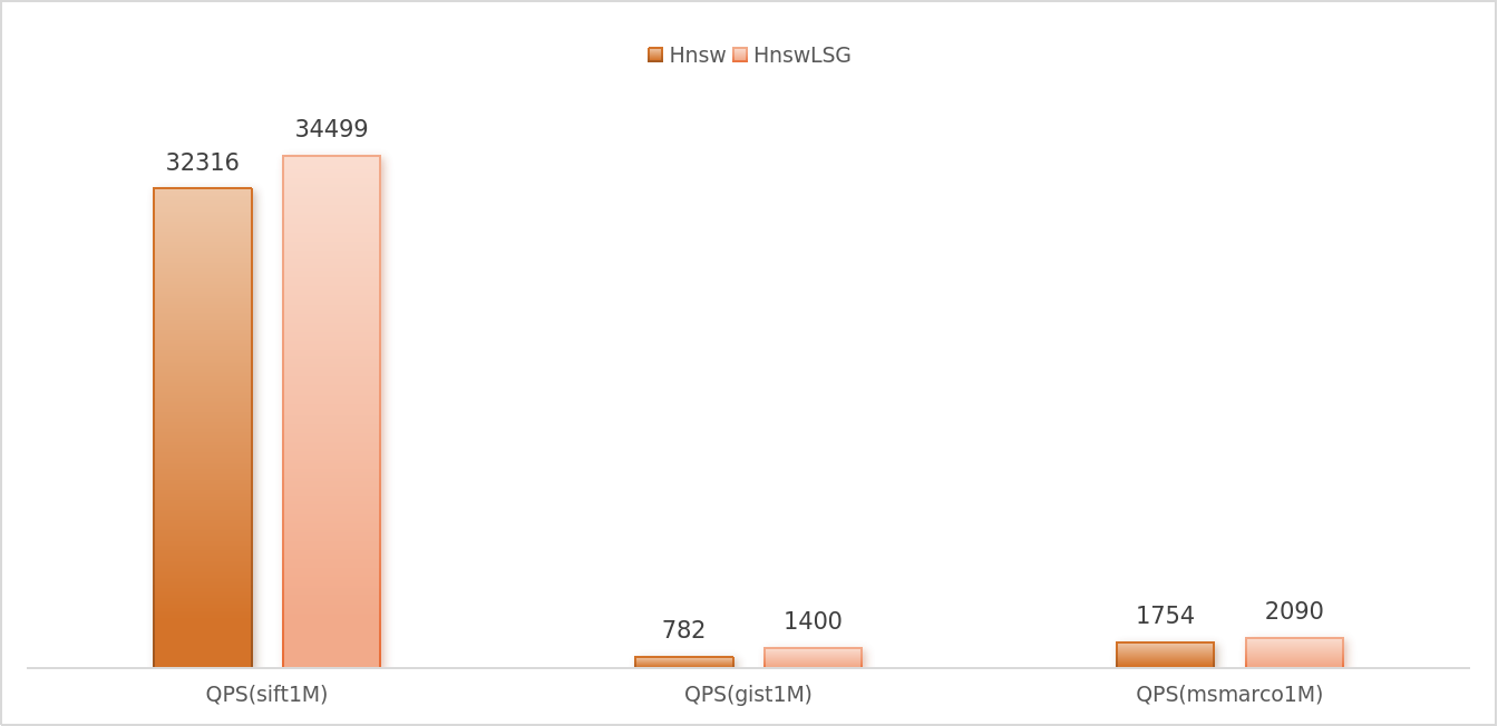 LSG optimizes the HNSW index in multiple ways. When the accuracy requirement is relatively lenient (< 99%), LSG exhibits higher QPS (Queries Per Second) compared to the original HNSW index.