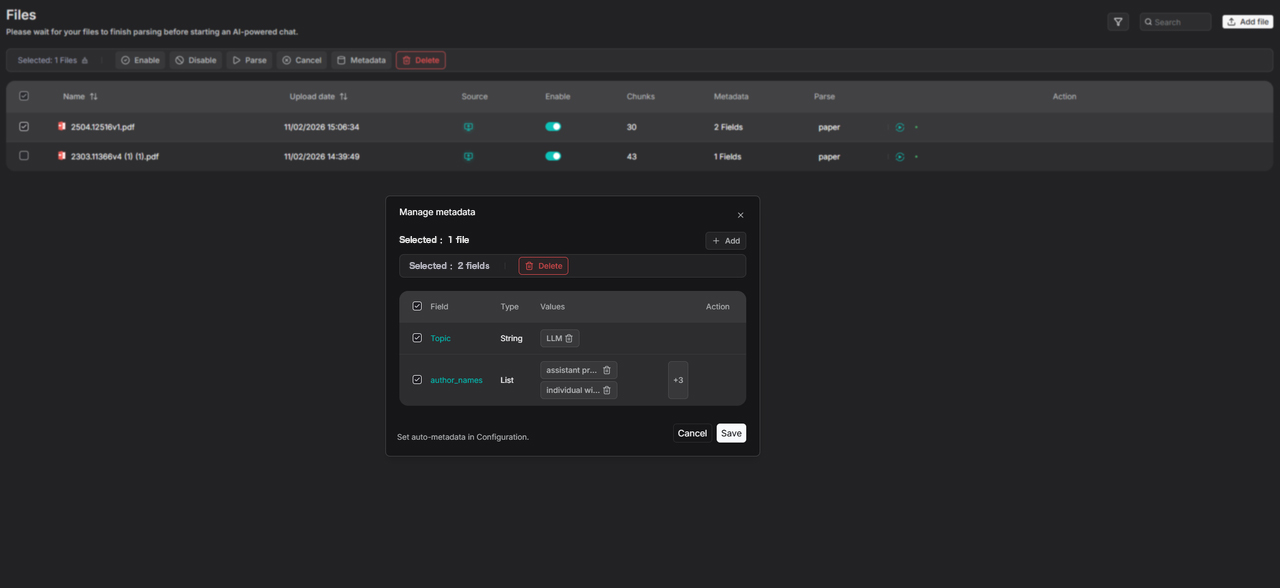 In previous versions of RAGFlow, maintaining metadata was a rather cumbersome process for developers. The platform now supports batch metadata management, allowing multiple files to be selected and their metadata managed simultaneously.