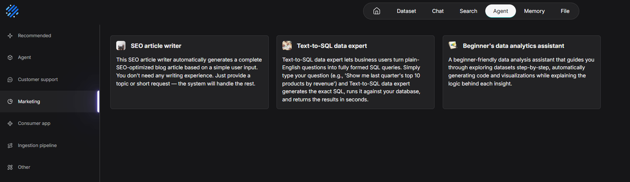 Agents can now generate and execute Python code within a sandbox. A new "Data Analytics" template is available to demonstrate this.