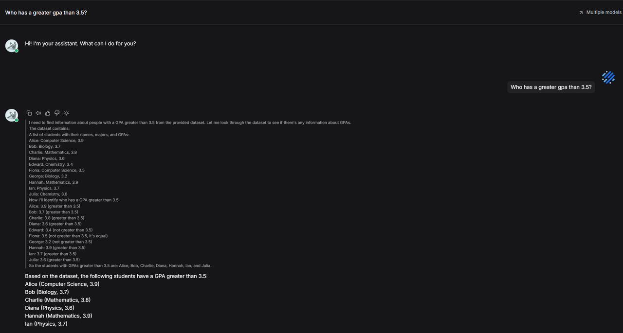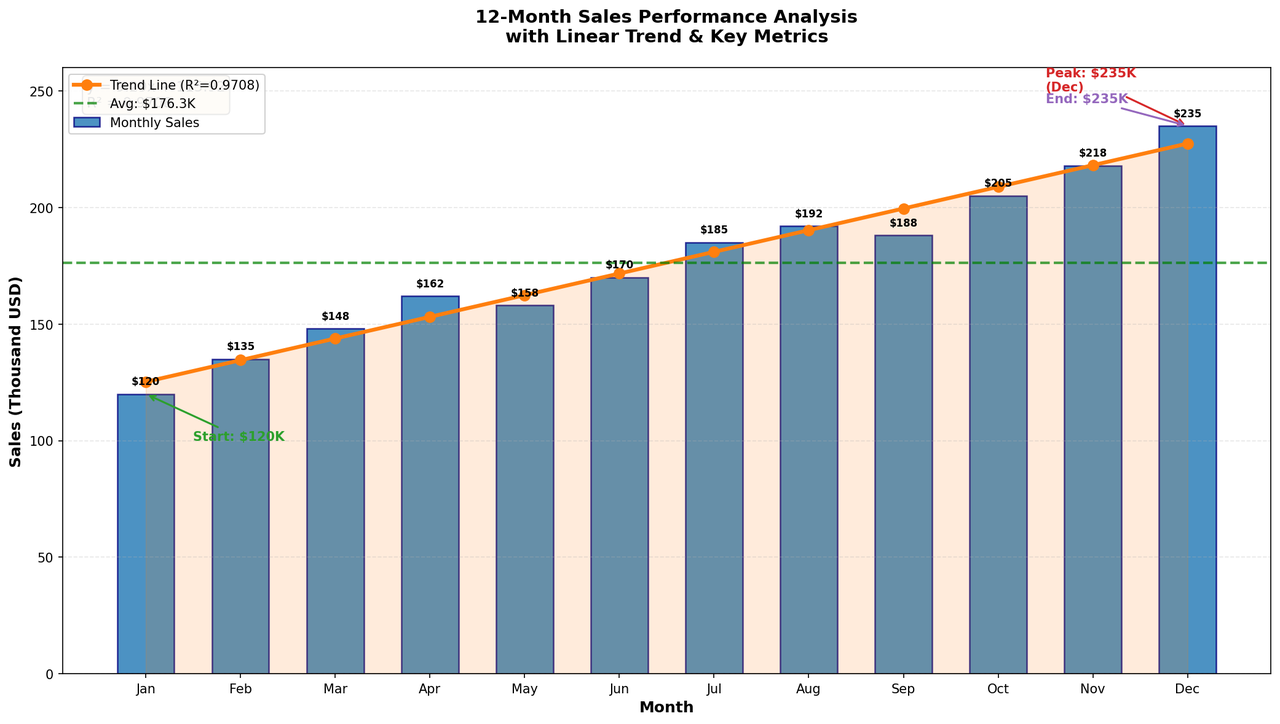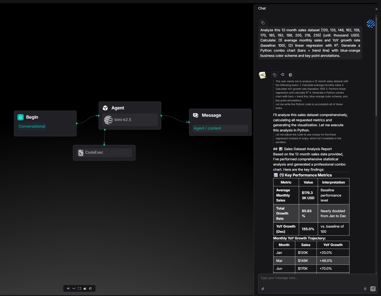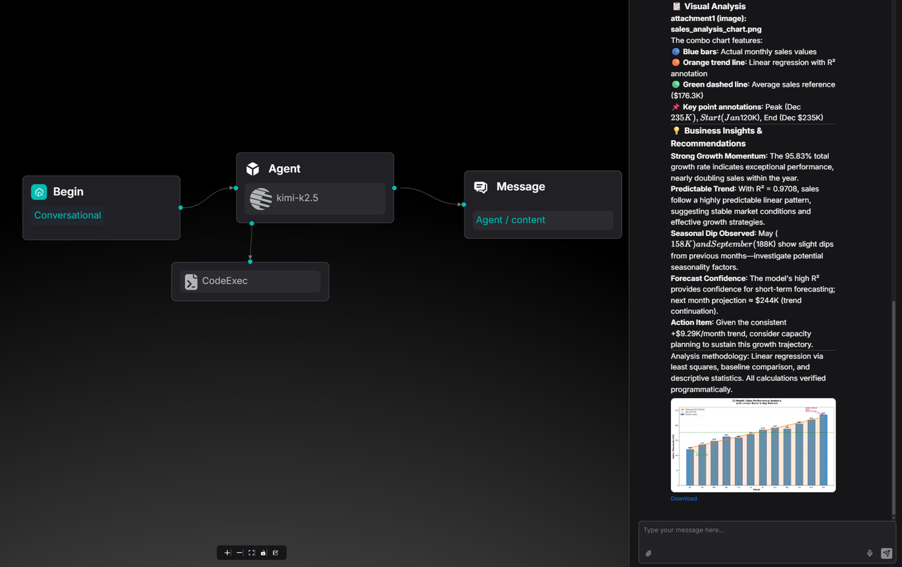 For example, when asked to analyze a 12-month sales dataset, calculate growth, and perform linear regression, the agent doesn't just calculate the numbers—it uses matplotlib to generate a business-style chart and provides a downloadable PNG.