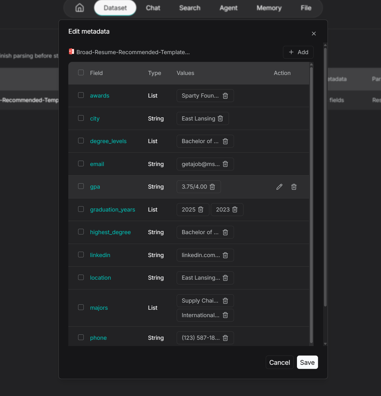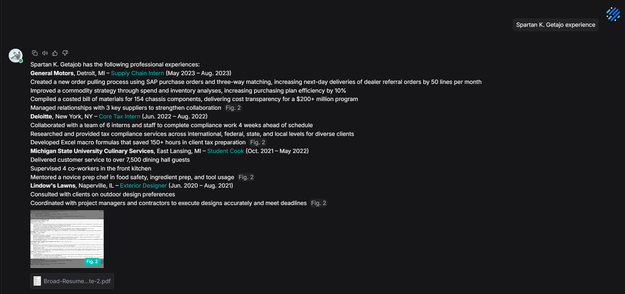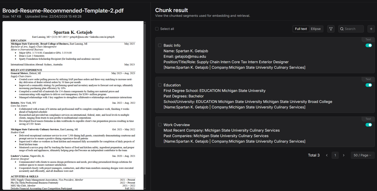 During chat, this metadata allows for accurate candidate positioning and retrieval of detailed experiences.