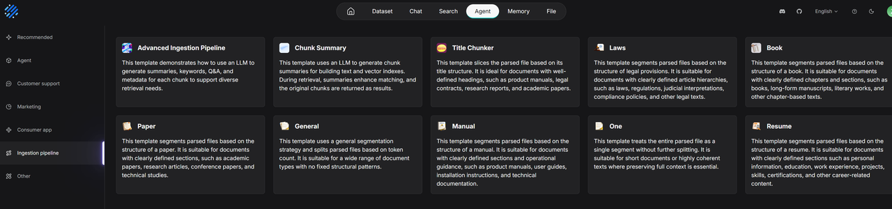 In 0.25, RAGFlow takes this further by adding 7 out-of-the-box pipeline templates that align with built-in strategies. Developers no longer have to choose between ease of use and flexibility: they can replicate official best practices with one click or adjust processing nodes like LEGO blocks.
