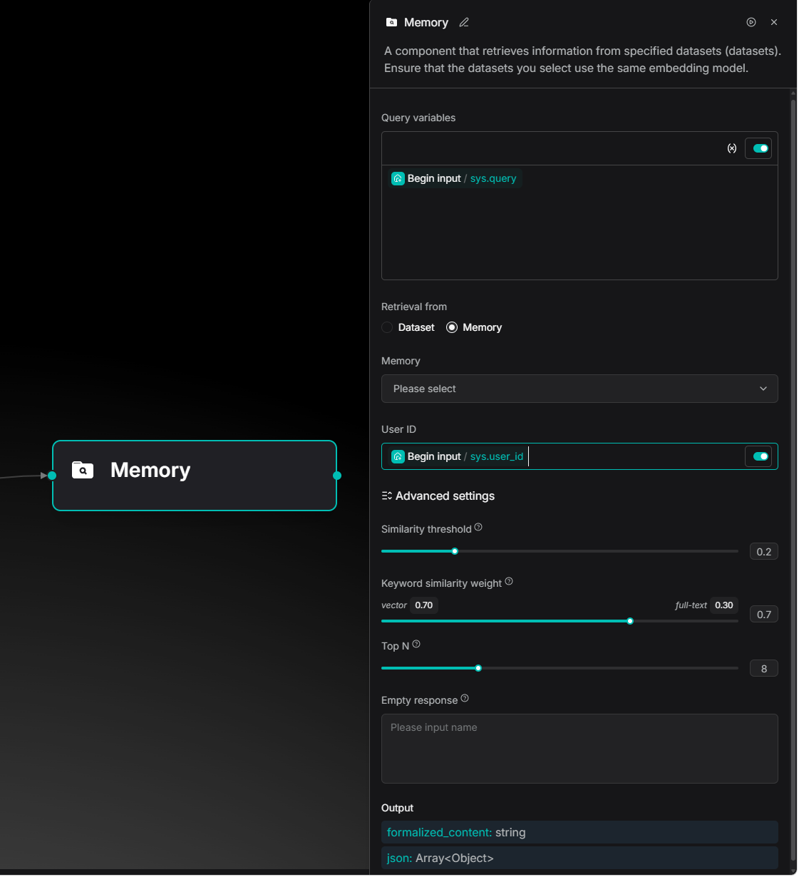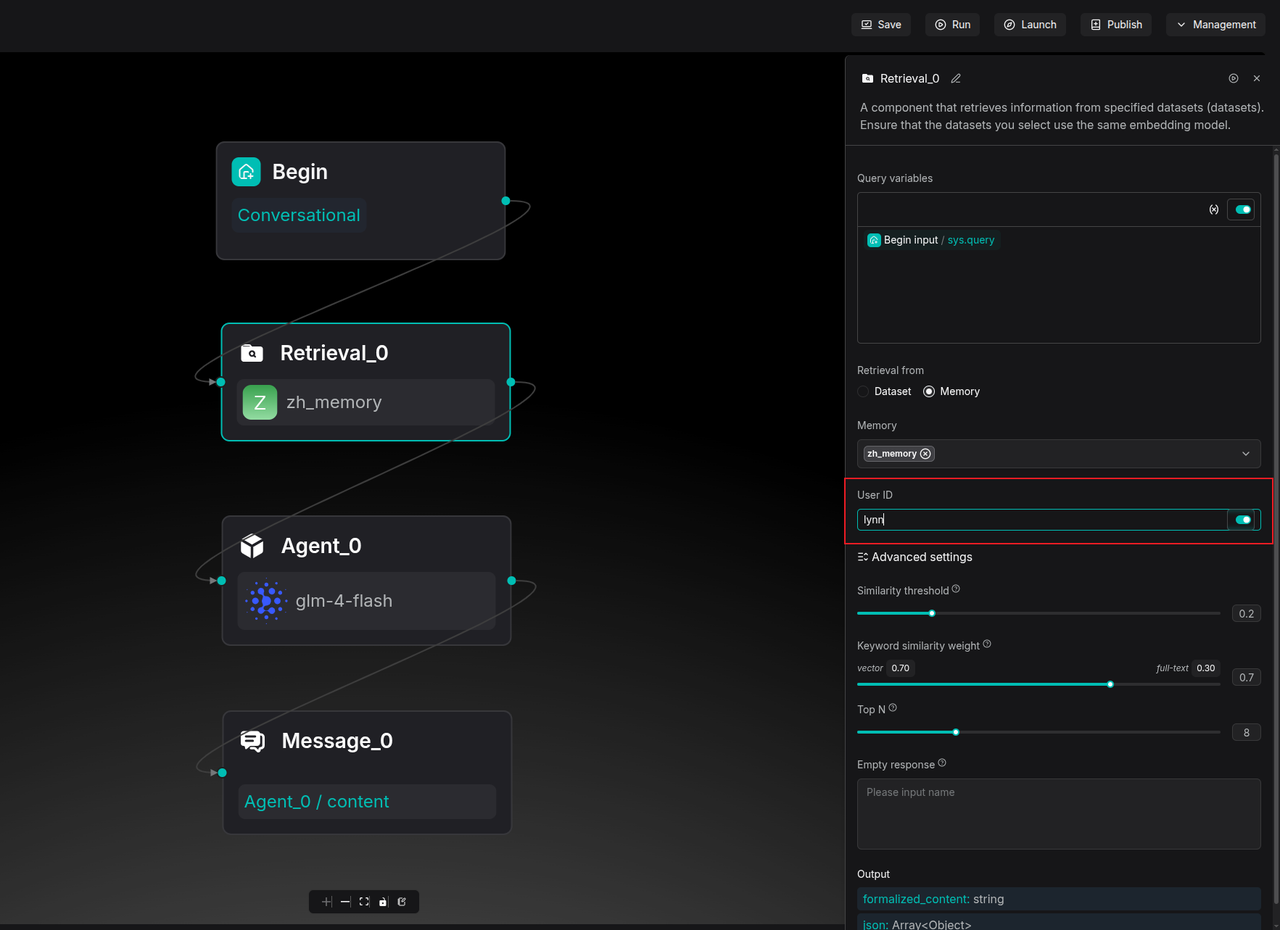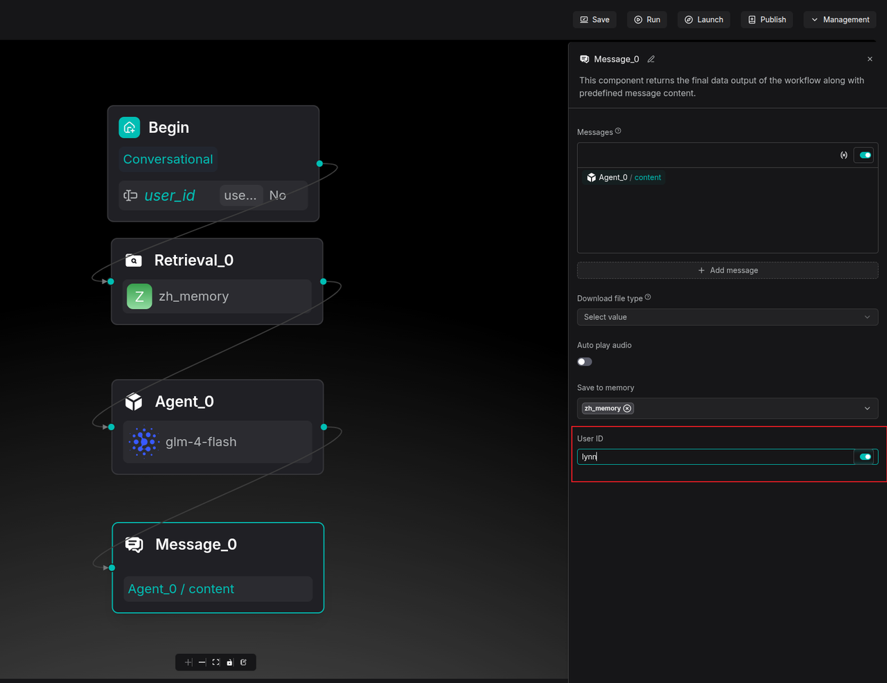 Version 0.25 introduces a User ID dimension to the Memory mechanism, enabling user-level isolation. This can be configured in the Message node on the Agent canvas.