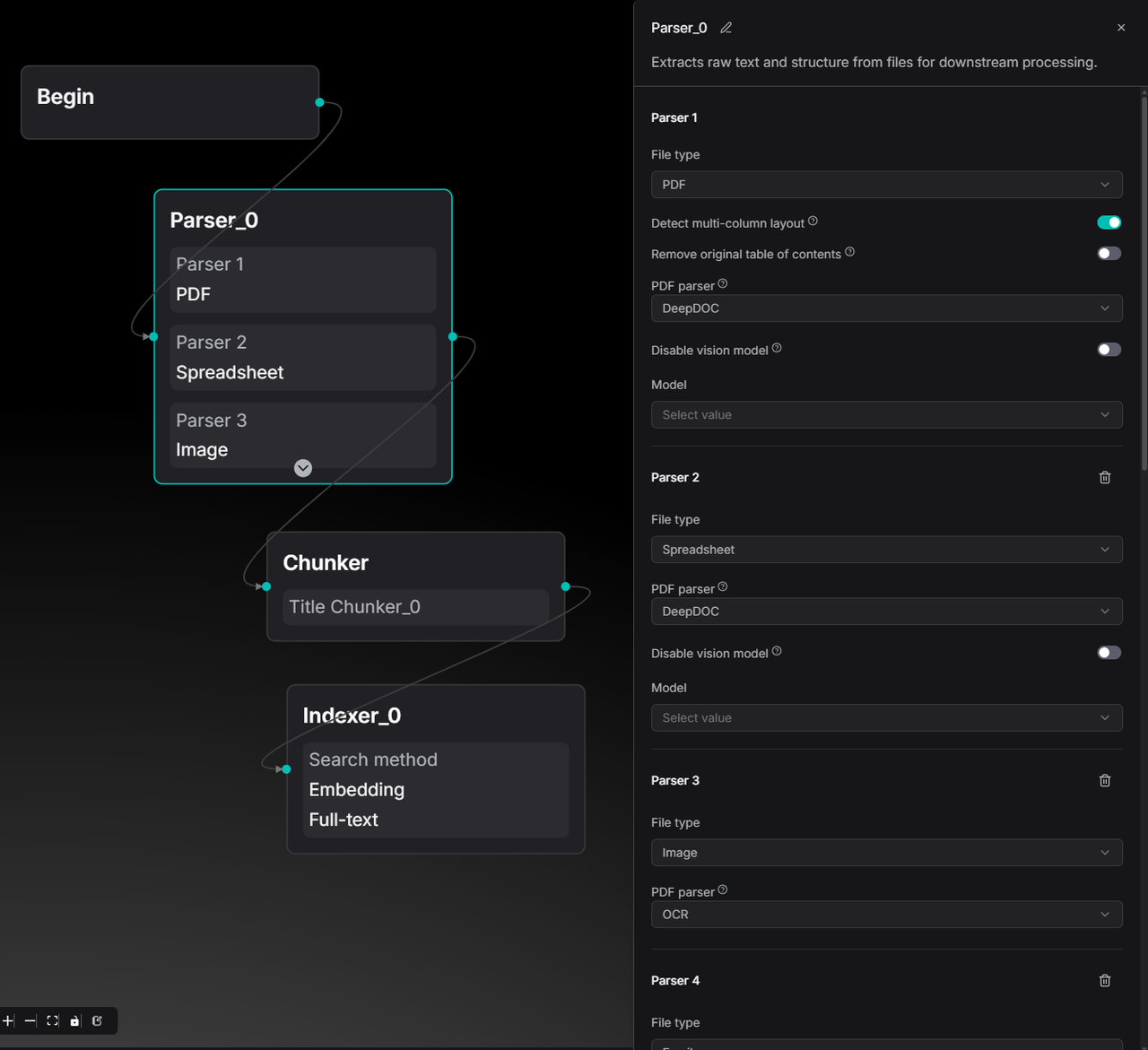 These templates allow developers to see the logic behind built-in data processing and modify it to meet business requirements. The image below shows a Paper template pipeline, which now offers multi-column detection in the Parser node compared to version 0.21.
