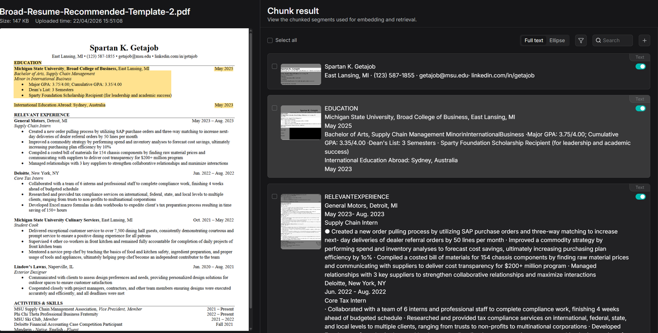 Solid data processing foundations enable more imaginative Agents. A comparison of resume parsing illustrates the difference: built-in parsing may result in incomplete segmentation.