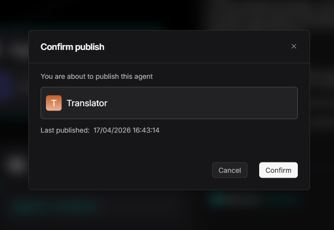 Once published, the current version is locked as the "online version." Subsequent experiments on the canvas (e.g., changing a translation target from English to Spanish) will not affect the live agent's behavior. To access the published version via API, set the release parameter to True.