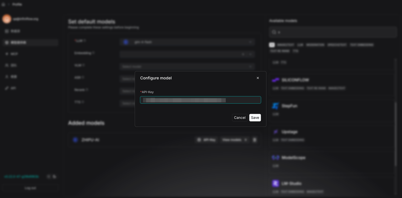 1. Configure a new model in the model settings interface to replace the unusable default model.