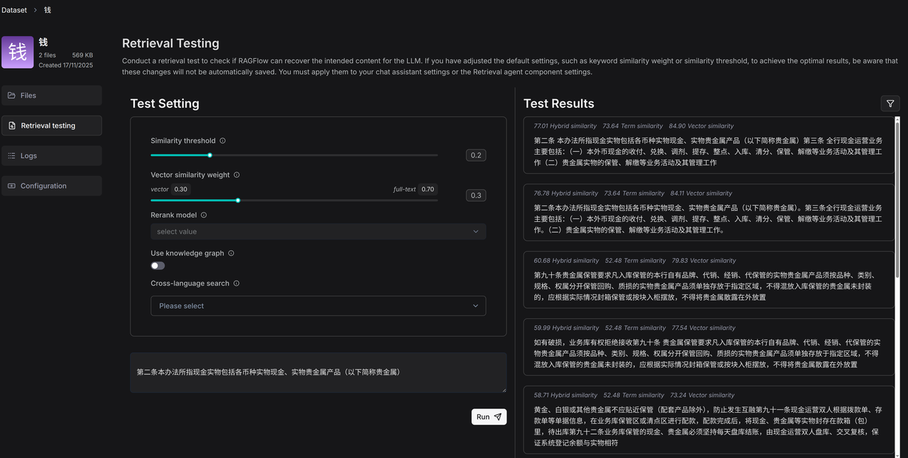 1. Enter Retrieval testing to self-assess the new embedding model.