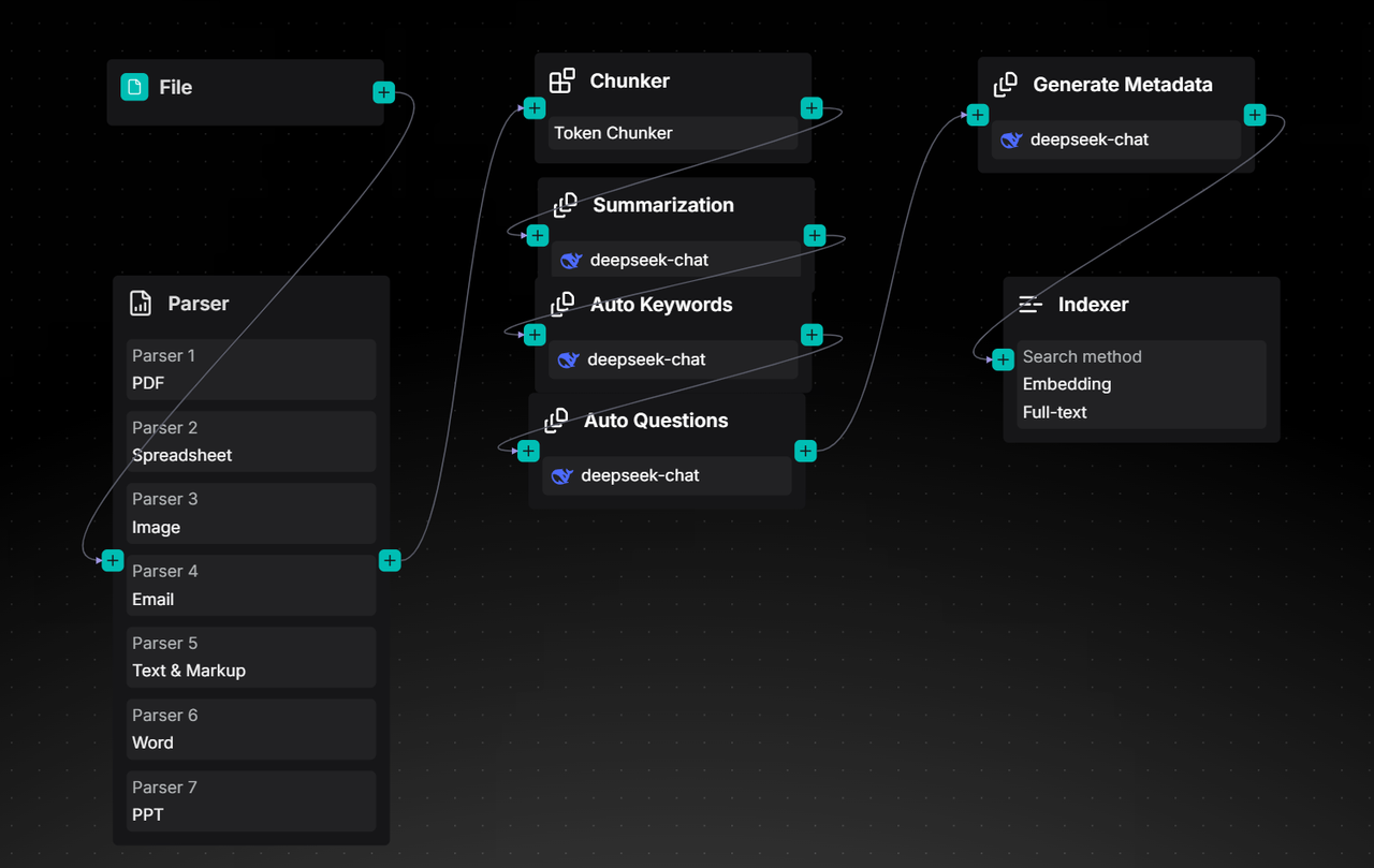 - Document Parsing: As a critical step in data cleaning, this module integrates multiple parsing models, with DeepDoc being a representative example. It transforms raw unstructured data into semi-structured content, laying the groundwork for subsequent processing.