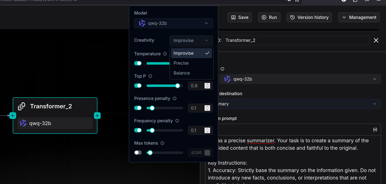 The current Transformer operator supports functions such as summary generation, keyword generation, question generation, and metadata generation. Users can choose to incorporate this operator into their pipeline to supplement the original data with these contents, thereby enhancing the final retrieval accuracy. Similar to other scenarios involving large models, the Transformer node also offers three modes for the large model: Improvise, Precise, and Balance.