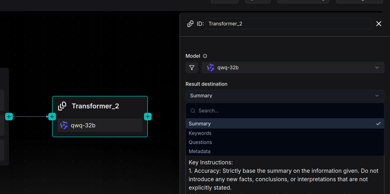 Next, switch the large model in the Transformer node to the desired model and set the "Result destination" field to "Metadata." This configuration means that the processing results (such as summaries) of the large model on text chunks will be directly stored in the file's metadata, providing capability support for subsequent precise retrieval and filtering.