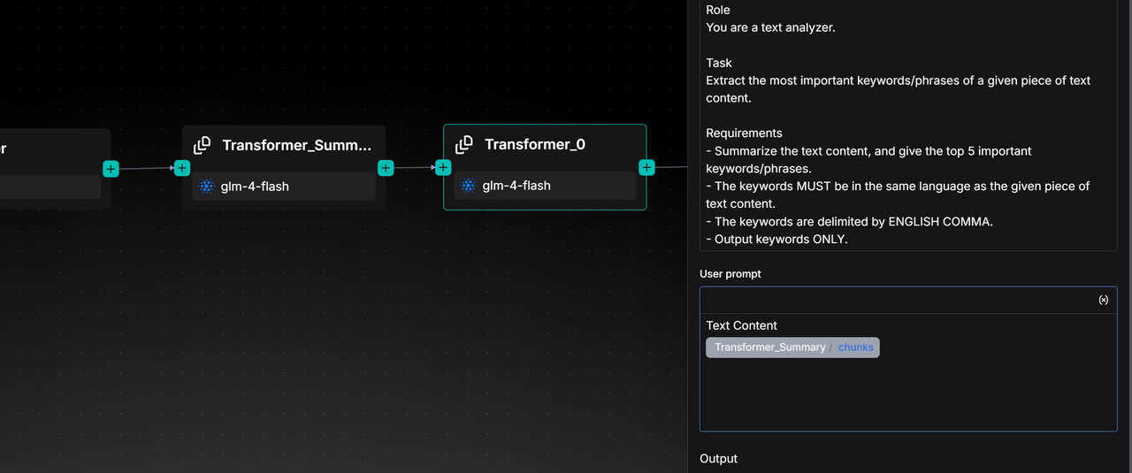 Similarly, when users choose to connect multiple Transformer nodes in series (e.g., the first one generates a Summary, and the second one generates Keywords), if the second Transformer references the Summary variable generated by the first Transformer, it will process this Summary as the "new original text" for further processing, rather than handling the text chunks from the more upstream Chunker.