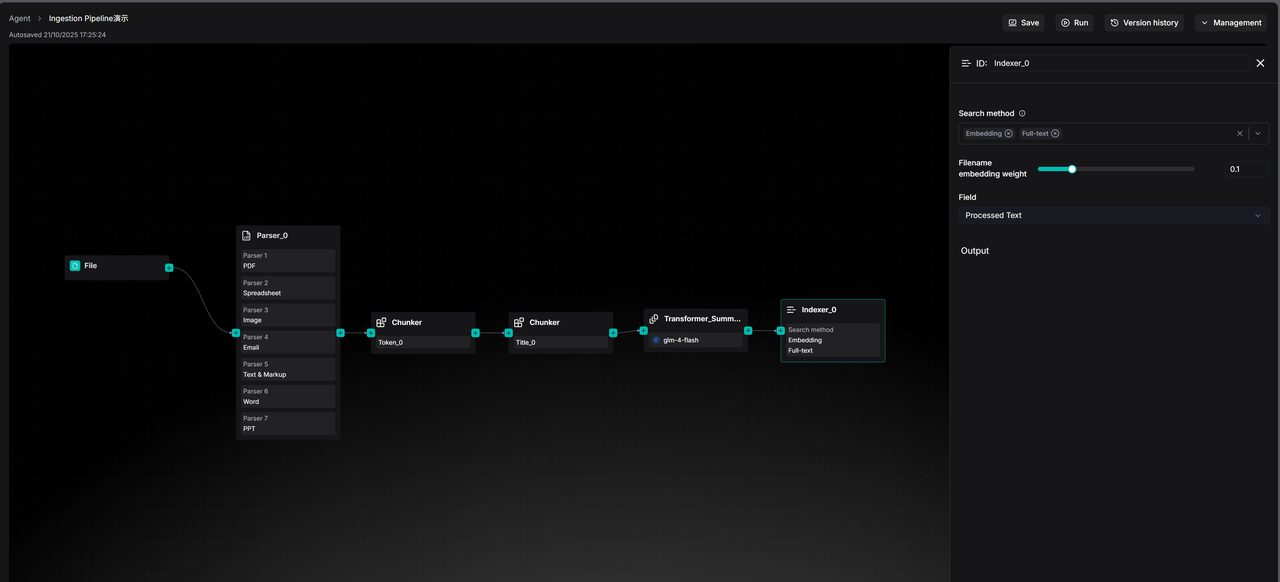 The Ingestion Pipeline is essentially a visual ETL process tailored for unstructured data. Built upon an Agent foundation, it restructures a typical RAG data ingestion workflow—which usually encompasses key stages such as document parsing, text chunking, vectorization, and index construction—into three distinct phases: Parser, Transformer, and Indexer. These phases correspond to document parsing, data transformation, and index construction, respectively.