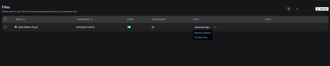 If users wish to adjust the Ingestion pipeline for a single file, they can also do so by clicking on the Parse location to make adjustments.