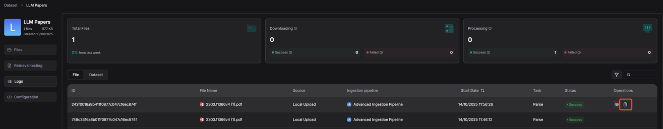 The execution of an Ingestion Pipeline may take a considerable amount of time, making observability an indispensable capability. To this end, RAGFlow provides a log panel for the Ingestion pipeline, which records the full-chain logs for each file parsing operation. For files parsed through the Ingestion Pipeline, users can delve into the operational details of each processing node. This offers comprehensive data support for subsequent issue auditing, process debugging, and performance insights.