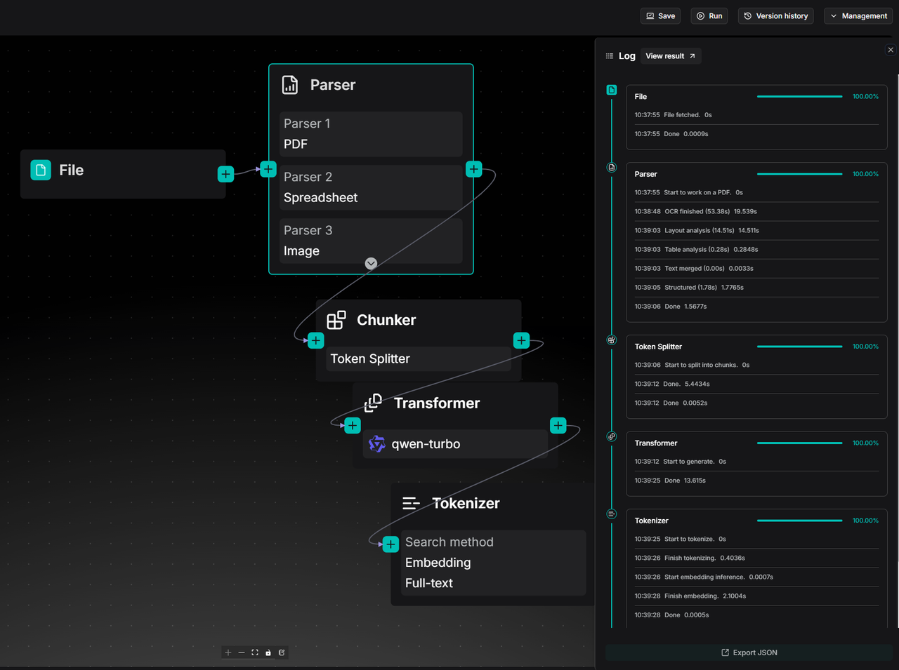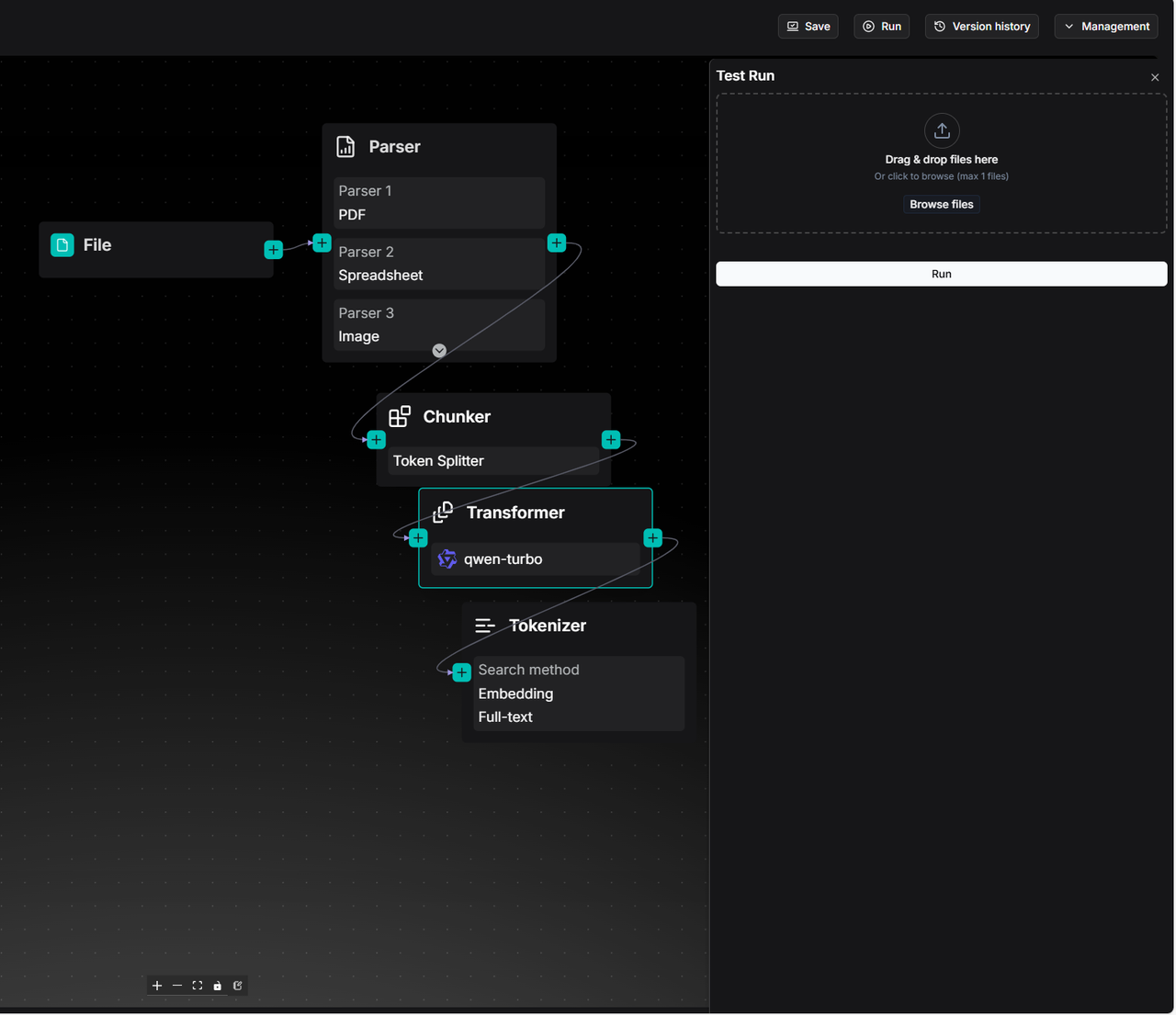 To address these challenges, RAGFlow 0.21.0 has introduced a groundbreaking Ingestion pipeline. This pipeline restructures the cleaning process for unstructured data, allowing users to construct customized data-processing pipelines tailored to specific business needs and enabling precise parsing of heterogeneous documents.