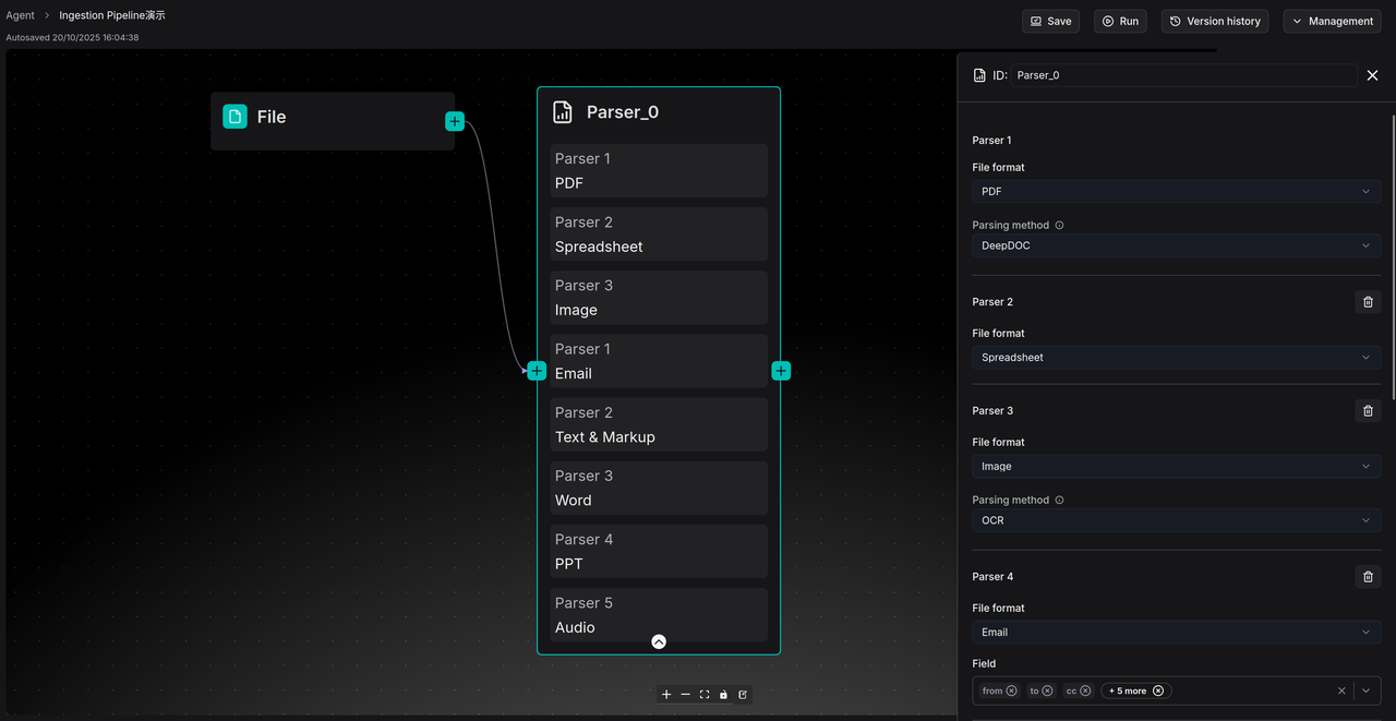When in use, simply click "Add Parser" within the Parser node and select the desired file category (such as PDF, Image, or PPT). When the Ingestion pipeline is running, the Parser node will automatically identify the input file and route it to the corresponding parser for parsing.
