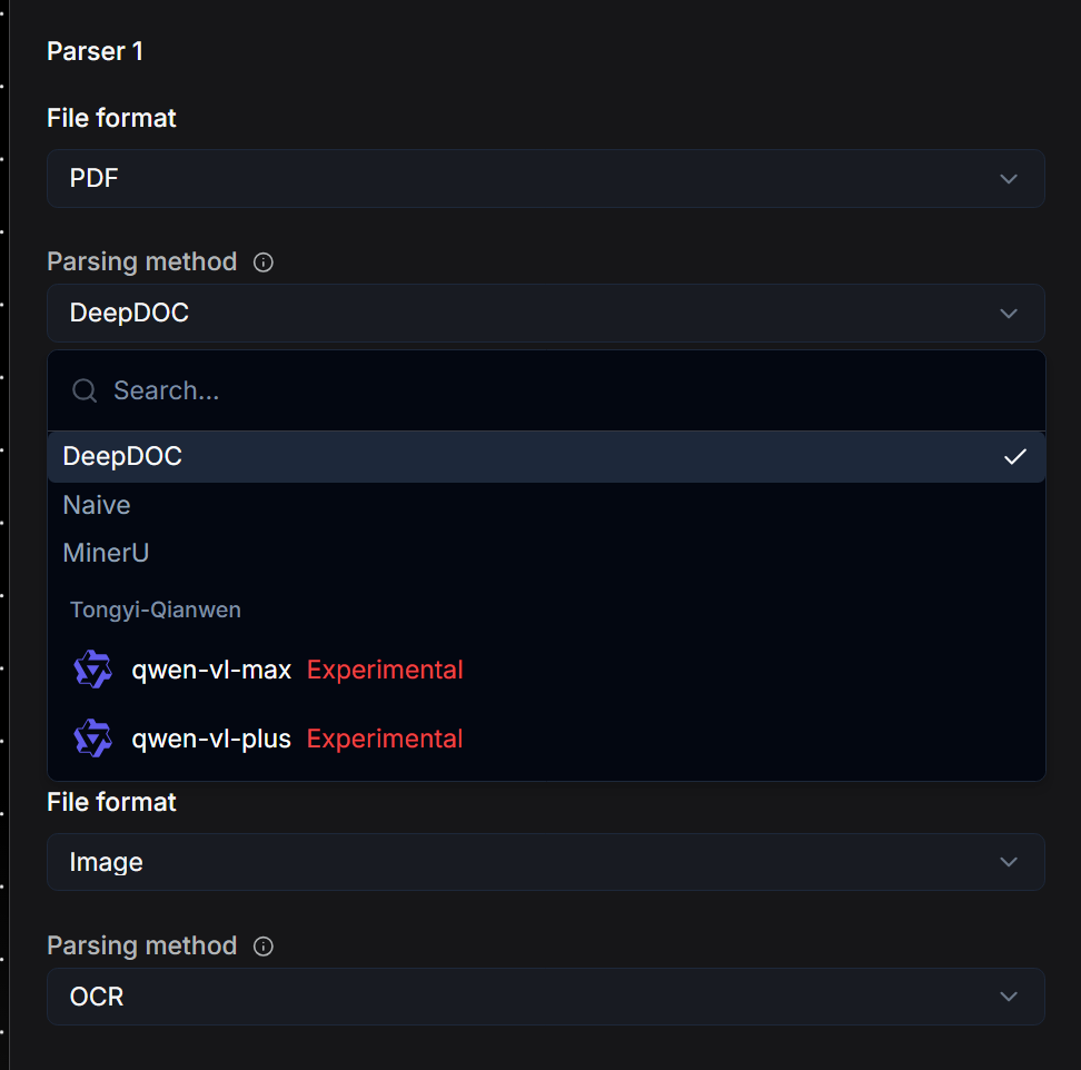 - For Image files, the system will by default invoke OCR to extract text from the image. Additionally, users can also configure VLMs (Vision Language Models) that support visual recognition to process them.