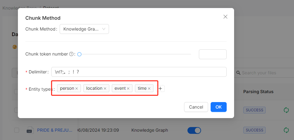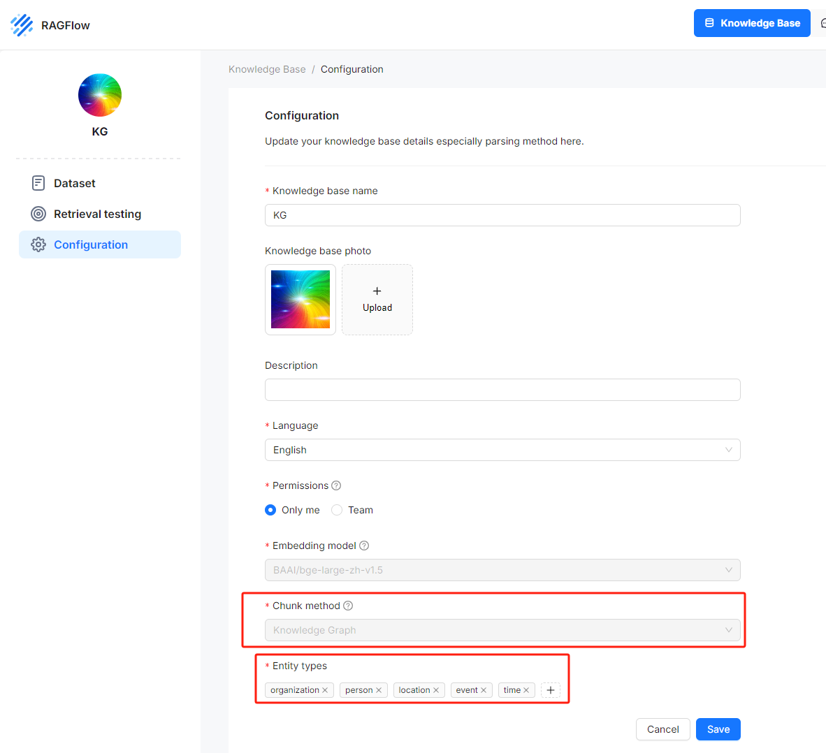 During the document parsing stage, users can choose "Knowledge Graph" as the chunking method for a specific knowledge base. They must also define the types of named entities that they wish the LLM to extract, such as "organization," "person," and "location," as shown in the figure below: